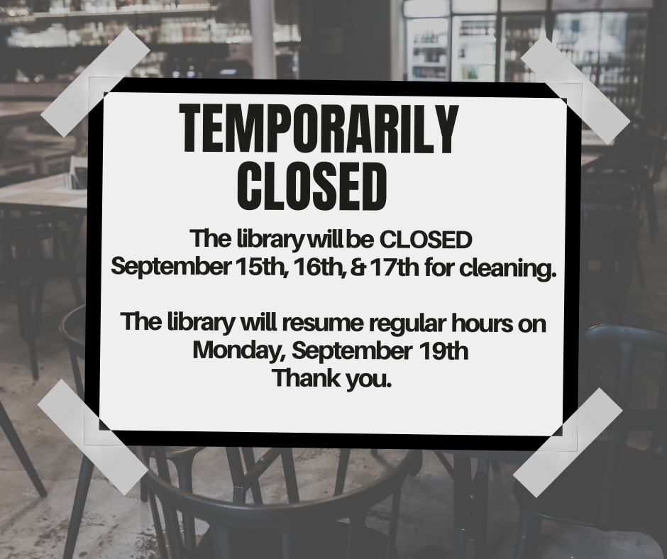 CLOSED FOR CLEANING THE IRONWOOD CARNEGIE LIBRARY WILL BE CLOSED ON September 15th, 16th, and 17th for cleaning. The library will be open again on Monday, September 19th with it's regular hours. We may be cleaning .png