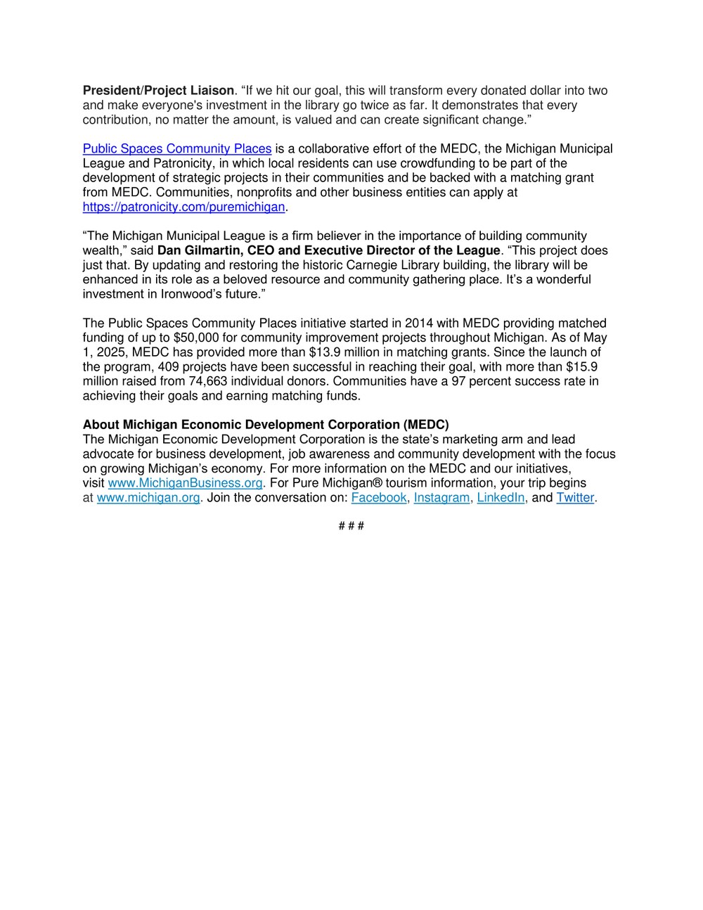 In February 2024, the library was awarded a $750,000 grant from the Michigan Department of Labor and Economic Opportunity to assist us in creating a space that supports our community in areas such as early childhood literacy, senior services, and workforce development. Bids were solicited and Meyer Group was selected for the architectural design and Ruotsala Construction for construction of the 1,000-square-foot addition to the library. Ground was broken in the spring of 2025, and the project's completion date is targeted for March 2026.