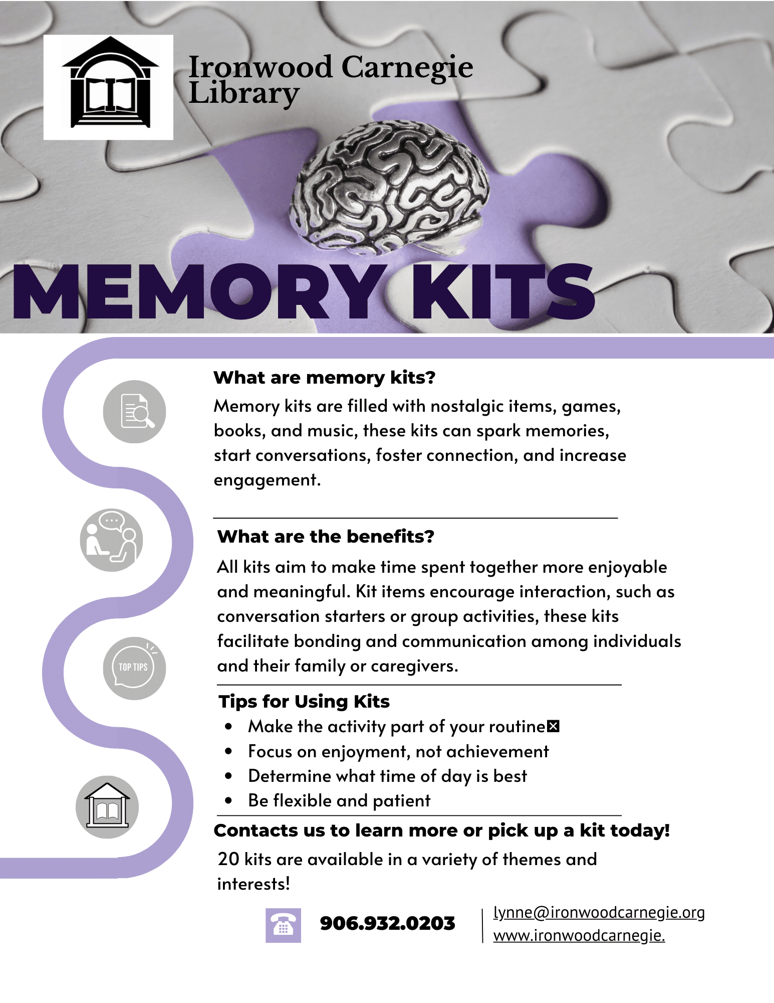 You can tailor Memory Kits to revolve around various themes, such as movie stars, fashion, cooking, or cars. Any interest that is meaningful to the person. Each kit may include related books, objects, DVDs, and games that evoke memories. Alternatively, kits can consist of a diverse range of activities like brain teasers, word puzzles, jigsaw puzzles, dominos, or a deck of cards. The possibilities are endless!